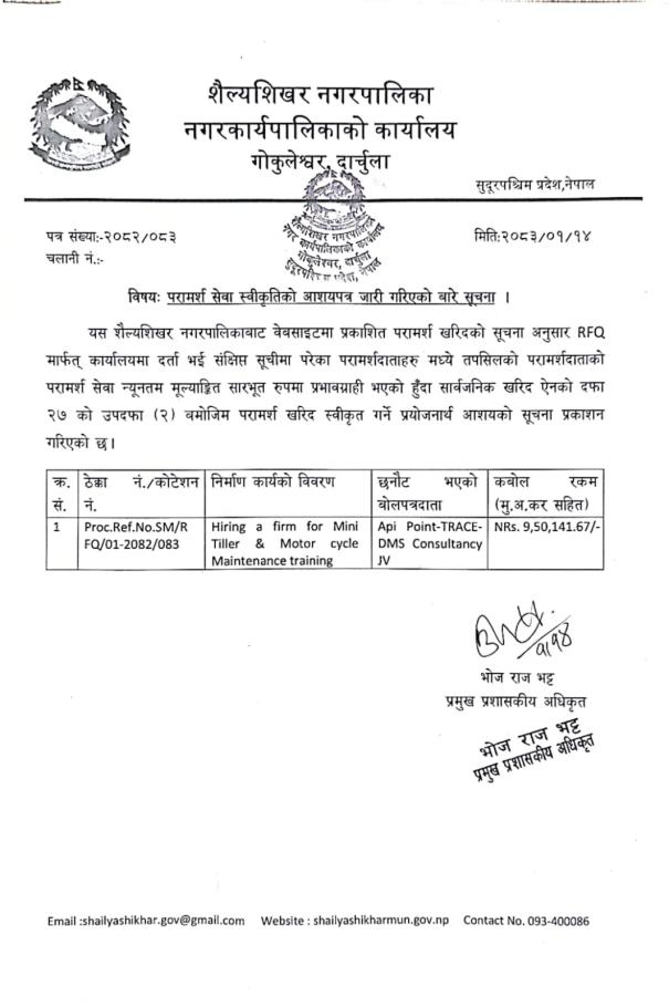 परामर्श सेवा स्वीकृतिको आशयपत्र जारी गरिएको बारे सूचना